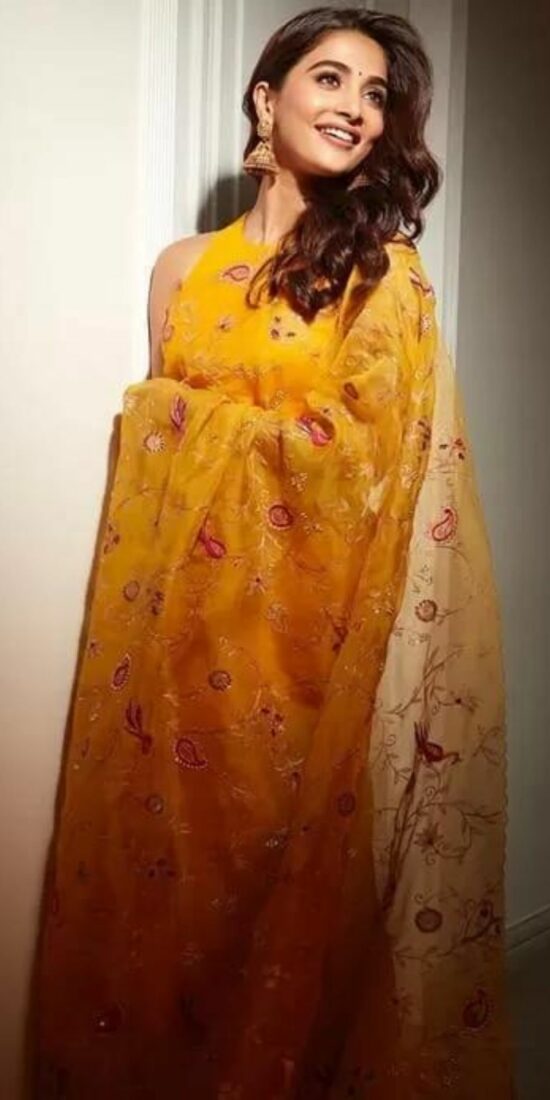 Pooja Hegde Goes The Ethnic Course In A Yellow Organza Silk Saree To Launch The Bubbly Season