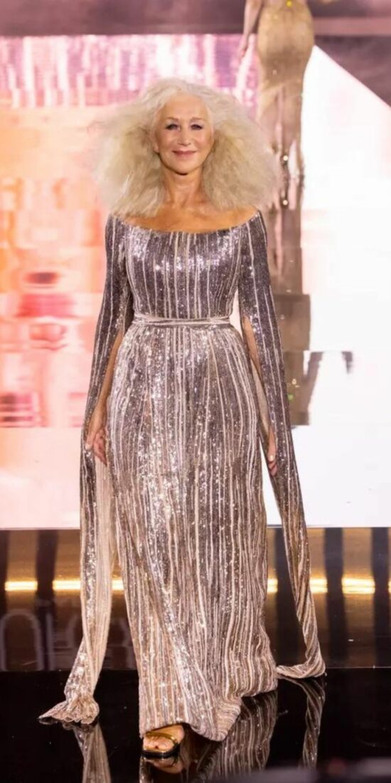 Helen Mirren lighting up the runway in shimmering silver at Paris Design Week
