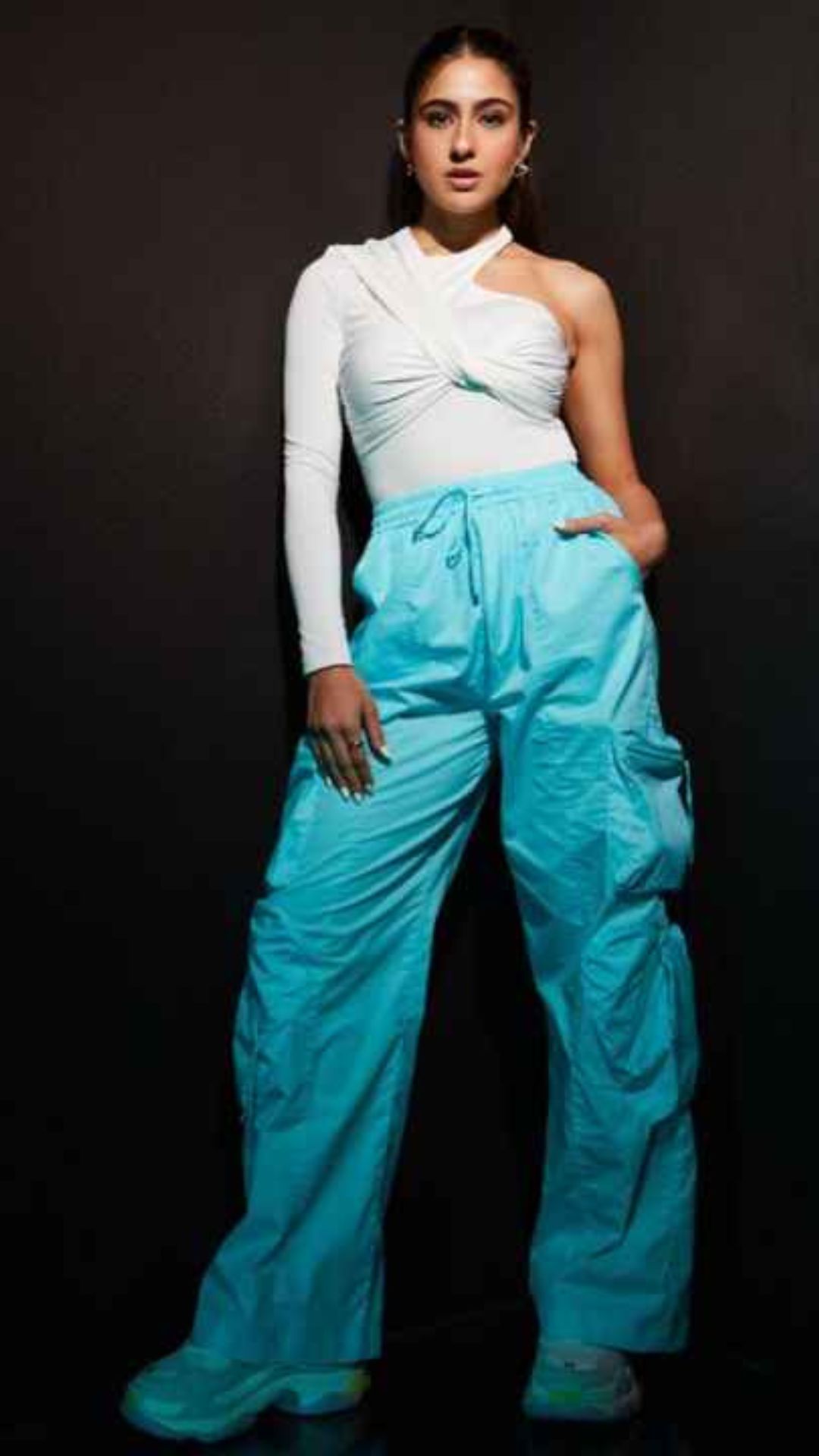Sara Ali Khan draws out the funk in white deviated bodysuit, sky-blue freight pants with Balenciaga shoes