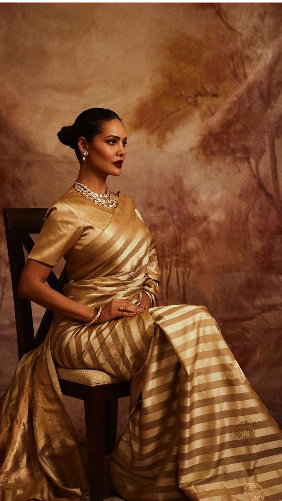 Esha Gupta exudes sophistication in a satin stripe saree a modern take on tradition.