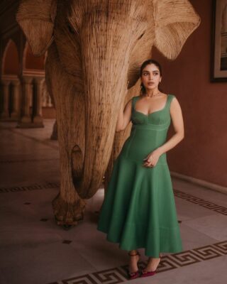 Basking in the soft rays of the winter morning sun holds an unparalleled sense of bliss, and Bhumi Pednekar certainly understands this sentiment well. During her recent visit to Udaipur, she skillfully combined the joys of soaking in some Vitamin D with an exploration of the city’s rich heritage, all while showcasing her impeccable fashion sense. Draped in elegance, Bhumi chose to don a stunning green midi dress sourced from the renowned designer label, Carolina Herrera. The sleeveless garment boasted a cinched waist, a sweetheart neckline, and elaborate ruffles at the hem, transporting the actress into a realm reminiscent of a bygone princess era.