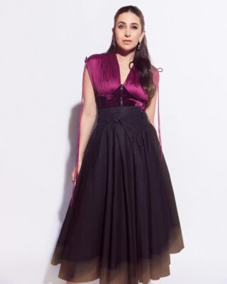 Karisma Kapoor is renowned for effortlessly embracing almost every trend and making it her own, and she did just that with her latest attire. She sported a stunning purple corseted top adorned with intricate hand-ruching, exuding a slightly sultry and contemporary vibe.This sleeveless velvet corset, featuring a front zipper, boasted a body-hugging silhouette that accentuated her enviable curves to perfection, along with a deep and plunging angular neckline that added a sexy twist. The ‘Veronica Corset Top’ was a creation like none other. It was paired with a dark blue calf-length skirt that exuded sheer elegance.The high-waisted skirt, featuring a belt-like fitted band, complemented the corseted top flawlessly, with its dark hue harmonizing beautifully with the top’s glossy and gothic tone.The well-crafted folds of the flowing skirt, with its asymmetrical style, gracefully swayed with Karisma Kapoor as she walked ahead with charm and confidence. This asymmetrical skirt, designed by Arjun Saluja, is a refreshing summer choice with a touch of modern artistry and allure.