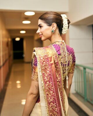 Kapoor’s ensemble, envisioned by Manish Malhotra, featured a soothing beige palette complemented by a metallic zari border. The blouse, imbued with a metallic purple hue, boasted intricate zardozi embroidery adorning its back. A traditional belt, intricately embellished with beads and precious stones, accentuated her waist, lending a defined silhouette to her attire. Completing her look were accessories comprising a blend of diamond and emerald pieces, including a resplendent neckpiece and a pair of elegant studs. Kapoor’s hair, styled into her signature sleek bun, was adorned with malli poo, adding a touch of traditional charm to her ensemble.
