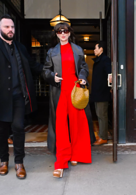 The leather jacket emerges as a standout piece, adorned with intricate details such as white trim and oversized hardware, accentuating its bold and boxy silhouette. Injecting a dash of vibrancy, Johnson accessorizes with a chic red Gucci bag that echoes the hues of her stylish shades, while anchoring the ensemble with chunky black over-the-knee boots. The dress, boasting a classic turtleneck silhouette, infuses an element of refined allure into the overall ensemble.In summary, Dakota Johnson’s fashion selections for the day epitomize a seamless marriage of timeless elegance and contemporary allure, establishing her as a prominent figure not only on the Madame Web press tour but also within the broader fashion landscape. Her innate ability to effortlessly blend sophistication with modernity cements her status as a fashion icon, leaving an indelible mark on each ensemble she dons.