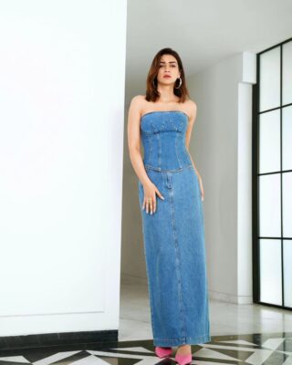 Kriti Sanon recently captivated onlookers in a stunning denim co-ord that effortlessly blended laidback vibes with polished elegance. The showstopper was undoubtedly the strapless corset top featuring shirred panels and a dolphin-shaped hem, adding delicate dimension. This couture-level denim ensemble boldly asserts that style knows no bounds.On the bottom, the actress, renowned for her role in “Mimi,” donned a high-waisted skirt with a subtly alluring back cut. Cleverly coordinated with the top, it completed this second denim dream.