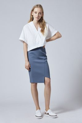 Planning for a sunny day trip? Thinking what to wear with a trip squad? Slub jersey pencil skirt is the one you can descend for. Cotton blend skirt with particular decorative buttons at the front makes it look even attractive. Subsequently, try to pair it with yellows to match sunshiny vibes.