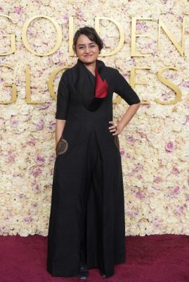 Award-winning director Payal Kapadia brought a unique blend of tradition and modernity in a black silk jumpsuit by designer Payal Khandwala. From the Autumn-Winter 2024 collection, this ethically crafted ensemble in handwoven matka silk celebrated Indian heritage while pushing the boundaries of contemporary fashion. With brocade pocket details and Khandwala’s signature loop neck, the jumpsuit highlighted Kapadia’s impeccable style and her dedication to sustainable fashion. While Kapadia did not win a Golden Globe for her debut film All We Imagine As Light, she made history as the first Indian to be nominated for Best Director, marking a pivotal moment for Indian cinema on the global stage.