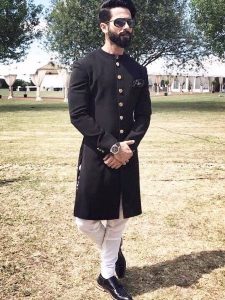 Shahid Kapoor looks very dashing in this evergreen pair of the royalty wearing black kurta and white pajama with classic shoes and a wristwatch to complete the look.