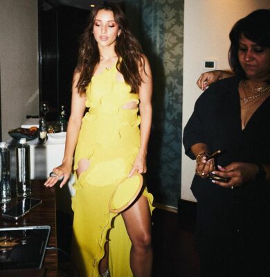 Tripti Dimri stole the spotlight as she strutted down the runway in a gorgeous yellow outfit from Cult Gaia. The alluring attire featured an asymmetrical neckline, adding a unique twist to the entire design. The one-shoulder design exuded elegance, while daring side cuts and a sensual thigh-high slit added an element of allure. The crinkled texture of the outer layer, with ruffle detailing, contributed to its distinct charm.This sophisticated outfit reflects Tripti’s daring fashion choices, proving that she is unafraid to make a statement both on and off the runway. Perfect for a beach destination wedding theme, her ensemble invites fashion enthusiasts to embark on their own style adventure, embracing trendy cuts that exude seaside allure.