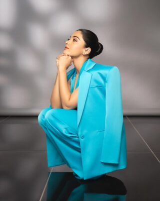 Credit must also be given to the brilliant stylist Ami Patel, who conceptualized Mandanna’s flawless powder blue pantsuit look. Photographer Aniruddh Kothari captured Mandanna’s stunning beauty in breathtaking photographs, showcasing the versatility and charm of the powder blue pantsuit as a perfect choice for any formal occasion, adding a touch of vibrancy to the entire ensemble.