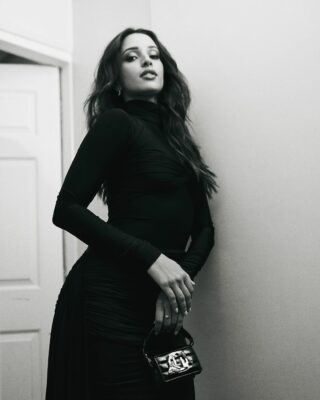The gown boasted full sleeves and a sophisticated turtle neck, setting a refined tone. However, what truly elevated this attire were the exquisite ruched details adorning the bust and waistline, adding a touch of glamour and sophistication. A striking departure from the norm was the trail cascading gracefully from one side of the waist, infusing a red carpet-worthy drama into the ensemble. Tripti’s choice of accessories was as precise as her outfit, opting for a mini black bag and statement earrings that flawlessly complemented rather than overshadowed her attire.