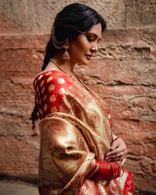 Gupta’s attire, a meticulously crafted Benarasi silk, radiated undeniable richness, capturing the essence of regality. Her choice of a rich red Benarasi silk saree draped over her shoulder exuded opulence, complemented by a classic makeup palette featuring smokey eyes, rust-nude lips, and a micro-red bindi, elevating the overall aesthetic. Her hair, styled in a classic braid, added a touch of tradition. Accessories played a pivotal role in accentuating the bridal look, with an exquisite gold necklace, jumkas adorning her hair, and a lavish set of red bangles, embracing the solah shringar tradition for Indian brides.