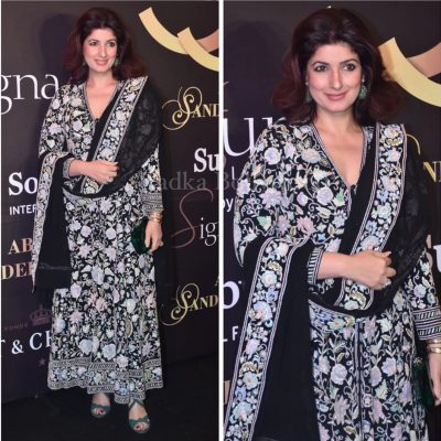 Bachchans were also present for their closest friends. Almost all were wearing the label to support them. Abhishek Bachchan spreads the magic of black in this all-black suit. While Jaya Bachchan and Shweta Bachchan Nanda looked marvelous in the white and golden royal outfits. Twinkle paired green with the black to add drama. The green jewelry and the clutch are so perfect for the black anarkali dress.