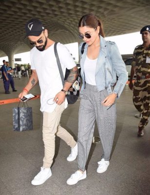Just a Casual Look with his wife, wearing a cotton tee and loose pants which are comfortable for a journey, one of his best airport looks with Anushka. White sneakers, his cap, and sunglasses just completed his look in a classy way. Both are wearing a white t-shirt giving us major couple goals.
