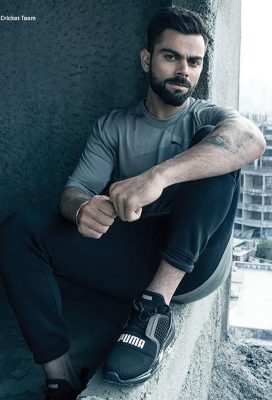 Virat all in Puma head to toe, sports shoes, sports outfit, with his bossy attitude, just a shoot for Puma, showing off the brand perfectly, super comfortable sports outfit, a black pant, and camouflage t-shirt with black sports shoes of Puma.