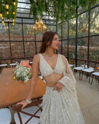 Complementing the lehenga was a stunning V-neckline bustier, adding allure and sophistication to the look. Tripti’s innovative draping technique with a transparent dupatta elegantly placed over her left shoulder captured attention, showcasing her impeccable fashion sense in blending conventional elements with a hint of innovation.